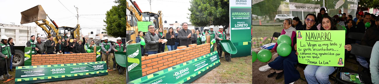 Soledad de Graciano Sánchez SLP.- El Alcalde de Soledad de Graciano Sánchez, Juan Manuel Navarro Muñiz, encabezó el arranque de la construcción del Parque Urbano en la Privada Loreto del Fraccionamiento La Virgen, una obra que fortalecerá la convivencia familiar y el bienestar de más de 3 mil habitantes de la zona, con una inversión superior a los 4.2 millones de pesos, provenientes del Fondo de Fortalecimiento Municipal, este espacio representa un compromiso cumplido con las familias soledenses.