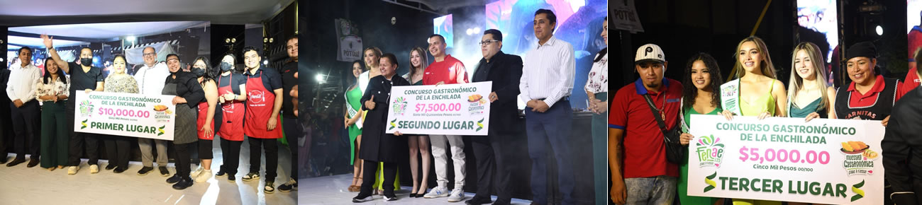 El primer lugar lo obtuvo Enchiladas “La Esperanza”, que obtuvo un premio de 10 mil pesos en efectivo; el segundo lugar, fue para Enchiladas “Morales”, con un premio de 7 mil 500 mil pesos y el tercer lugar, lo alcanzó Enchiladas y Carnitas “Rodríguez”, con 5 mil pesos.