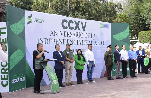 Soledad de Graciano Sánchez SLP.- Juan Manuel Navarro Muñiz, Alcalde de Soledad de Graciano Sánchez, encabezó esta mañana el acto solemne por el CCXV aniversario de la Independencia de México, previo al inicio del tradicional Desfile cívico; en su mensaje, destacó que esta conmemoración es un recordatorio del valor y la convicción de mujeres y hombres que dieron patria y libertad, y subrayó que hoy corresponde a las y los mexicanos mantener vivo ese legado a través de la solidaridad, el compromiso social y la construcción de un mejor futuro.