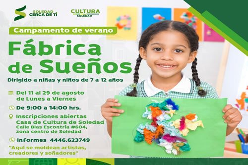 Soledad de Gtraciano Sánchez SLP.- El Gobierno Municipal de Soledad de Graciano Sánchez impulsa la cultura y el desarrollo integral de las niñas y niños del municipio con la apertura del taller “Fábrica de Sueños” en la Casa de la Cultura, este programa, que inicia el próximo lunes 11 de agosto, funcionará como un campamento de verano extendido, brindando actividades artísticas para niños de 7 a 13 años de edad, siguiendo las instrucciones del Alcalde Juan Manuel Navarro Muñiz, de generar espacios cercanos y seguros para el crecimiento creativo y cultural de la niñez soledense.