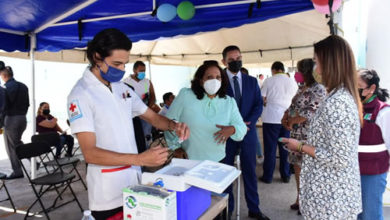 Alcaldesa Leonor Noyola realiza recorrido en puesto de vacunación contra COVID-19.