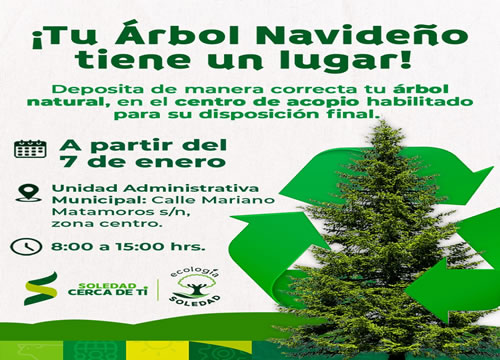 Para reducir residuos, promover el reciclaje orgánico y fortalecer la cultura ecológica entre las familias soledenses, el Ayuntamiento de Soledad de Graciano Sánchez puso en marcha un programa de recolección de árboles naturales utilizados durante la temporada navideña, una acción ambiental que mantiene una política cercana a la población y atenta al cuidado del entorno, siguiendo la visión del Alcalde Juan Manuel Navarro Muñiz.