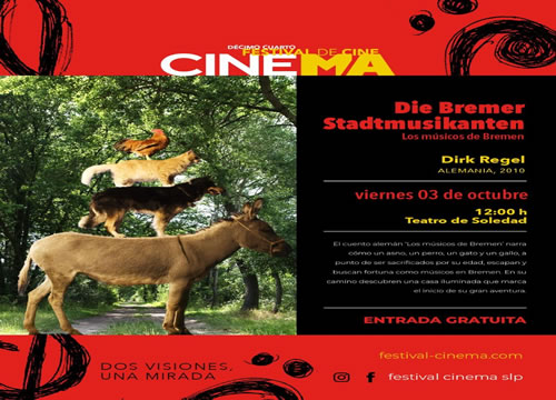 Finalmente, para el viernes 3 de octubre al mediodía se compartirá Die Bremer Stadtmusikanten, dirigida por Dirk Regel, una producción alemana basada en el tradicional cuento de Los músicos de Bremen, que es apta para toda la familia.