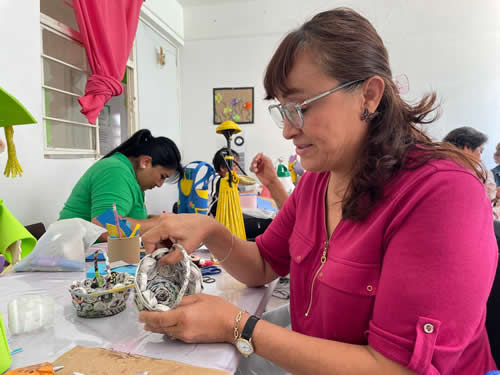 Claudia Salas Rodríguez, responsable de la Coordinación, destacó que estos trabajos, que combinan materiales reciclables como periódico y café con insumos nuevos, fomentan la creatividad, y representan una oportunidad real de generar ingresos desde casa; la mayoría de quienes acuden son personas jubiladas o amas de casa, quienes encuentran en estos espacios una forma digna de contribuir a la economía familiar.
