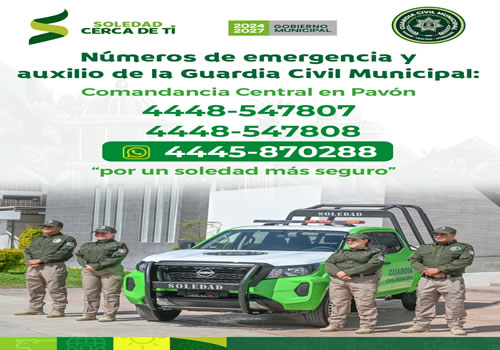 Soledad de Graciano Sánchez SLP.- En aras de fortalecer el plan de seguridad y la atención oportuna a la ciudadanía, asegurando la salvaguarda de su integridad, la Guardia Civil Municipal 👮🏼 de Soledad de Graciano Sánchez pone a disposición dos líneas telefónicas, además de un canal de WhatsApp, para recibir llamados de auxilio y atender incidentes viales y hechos con apariencia de delito. 🚔