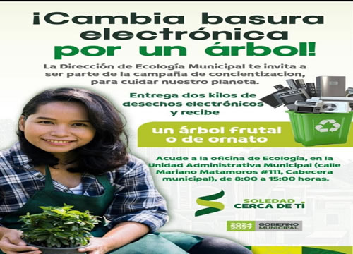 Soledad de Graciano Sánchez SLP.- SLP.- Con el propósito de fortalecer la conciencia ambiental y promover la disposición responsable de residuos tecnológicos, el Ayuntamiento de Soledad de Graciano Sánchez mantiene activa la campaña de recolección de basura electrónica, que busca reducir la contaminación y fomentar la reforestación, siguiendo las instrucciones del Alcalde Juan Manuel Navarro Muñiz, la Dirección de Ecología invita a las y los soledenses a participar en esta iniciativa que ofrece un arbolito a cambio de los aparatos en desuso.