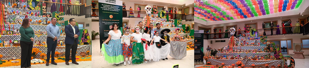 Soledad de Graciano Sánchez SLP.- Juan Manuel Navarro Muñiz, Alcalde de Soledad de Graciano Sánchez, inauguró, este martes, el Altar de Muertos Monumental instalado en en el interior de la Presidencia Municipal, que este año se encuentra dedicado a la memoria de las y los trabajadores municipales que ya partieron, como un reconocimiento a su entrega y servicio al pueblo soledense; esta ofrenda es parte de la Festividad de Muertos 2025, que desde el pasado jueves ha llenado de color y tradición las calles con comparsas y actividades culturales.