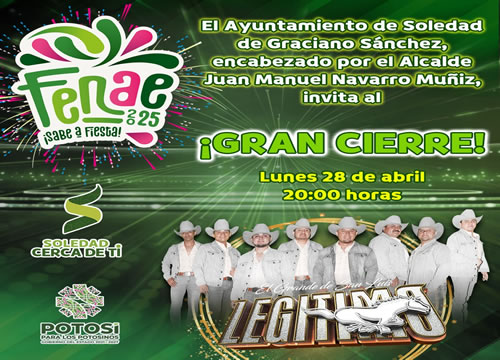 Soledad de Graciano Sánchez SLP.- La Feria Nacional de la Enchilada (FENAE) 2025 llegó a su último día de emocionantes actividades musicales, artísticas, gastronómicas y culturales, en las que familias enteras locales, nacionales e internacionales han disfrutado de una variedad de atractivos en un ambiente de paz y tranquilidad, y este décimo día, el Alcalde, Juan Manuel Navarro Muñiz invita a toda la población a ser parte del gran cierre, con la presentación musical del orgullo musical potosino, Grupo Legitimo.