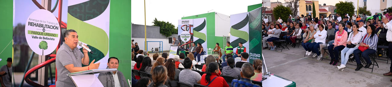 Soledad de Graciano Sánchez SLP.- Rodeado del cálido recibimiento de vecinas y vecinas del fraccionamiento Valle de Bellavista, Juan Manuel Navarro Muñiz, Alcalde de Soledad de Graciano Sánchez, dio el banderazo de arranque a los trabajos de reconstrucción de un nuevo Parque Urbano, mismo que contará con infraestructura moderna, iluminación y áreas para el disfrute de todas las familias; con una inversión de 1.3 millones de pesos, este espacio de convivencia social beneficiará a más de 3 mil habitantes de la zona.