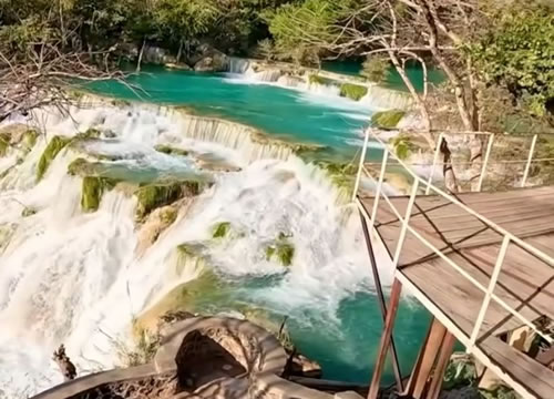 A 270 kilómetros de la capital del Estado, que forma parte de la “Ruta Turquesa”, un circuito turístico que deslumbra con sus aguas cristalinas y tonos azulados. Las y los visitantes que acudieron a este paraje durante estas vacaciones, fueron conquistados con la belleza de su caída de 35 metros, que fluye sobre terrazas naturales y ofrece un espectáculo visual pocas veces visto.