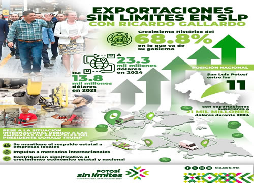 En los cuatro años que Ricardo Gallardo Cardona lleva al frente de la gubernatura del Estado, San Luis Potosí ha incrementado 68.8 por ciento el valor de sus exportaciones, al pasar de 13.8 mil millones de dólares registrados en el cuarto trimestre del 2021 a 23.3 mil millones de dólares correspondientes al cuarto trimestre del 2024.