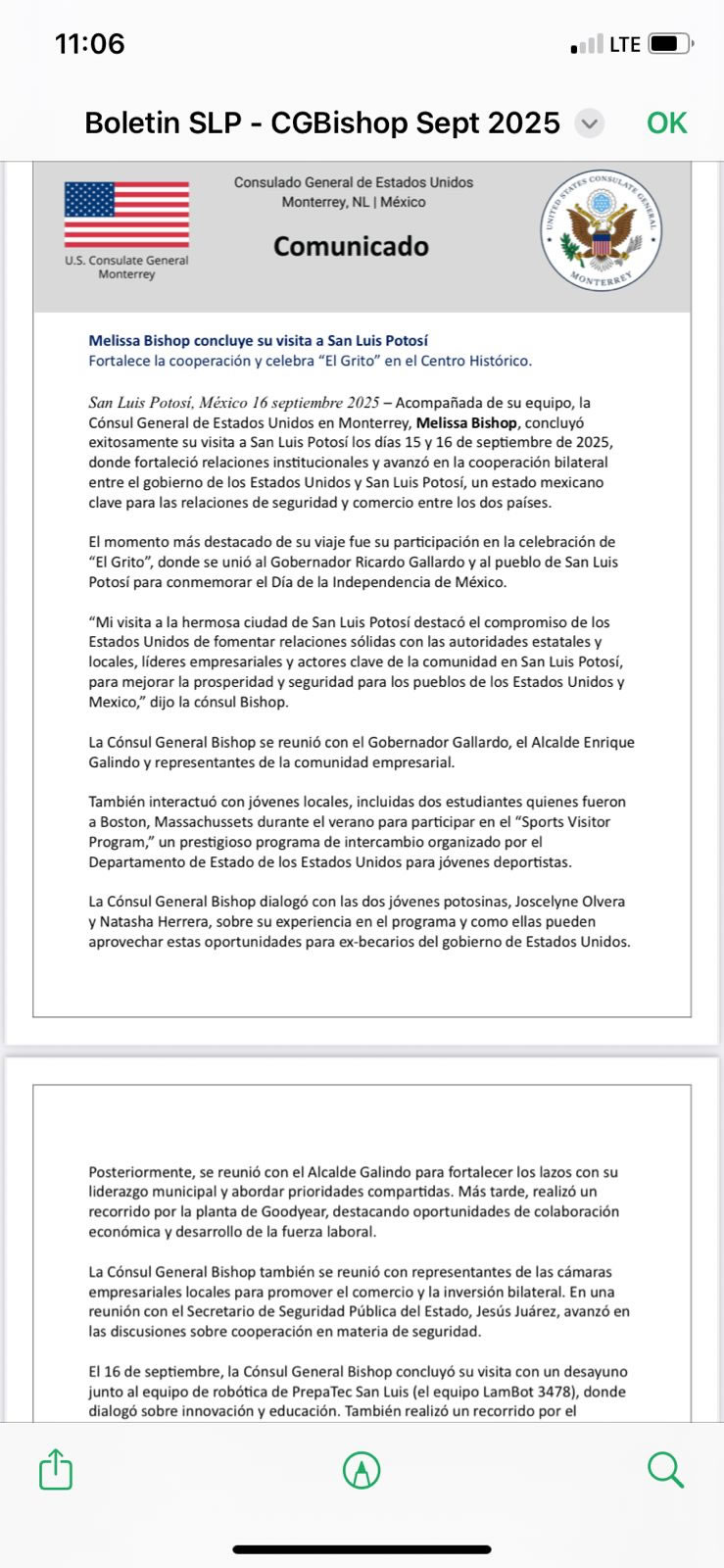 El Gobernador Ricardo Gallardo Cardona encabezó los encuentros oficiales, demostrando un liderazgo que impulsa la seguridad, educación e infraestructura sin límites. La funcionaría también participó en la celebración del Grito de Independencia, reflejo del respaldo institucional y la confianza que Estados Unidos tiene en la estrategia y gestión del Gobierno Estatal.