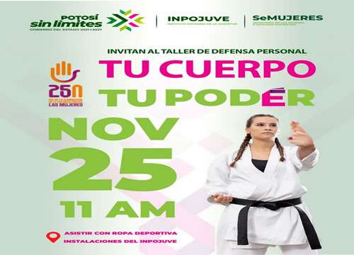 San Luis Potosí SLP.- Como parte de las actividades por el 25 de noviembre Día Internacional de la Eliminación de la Violencia contra la Mujer, el Instituto Potosino de la Juventud (Inpojuve) y la Secretaría de las Mujeres e Igualdad Sustantiva (Semujeres), invitan a participar en el taller de defensa personal “Tu cuerpo, tu poder”, impartido por la sensei segundo Dan en Karate Do, Grecia Villa, el próximo 25 de noviembre a las 11:00 horas en las instalaciones del Inpojuve.
