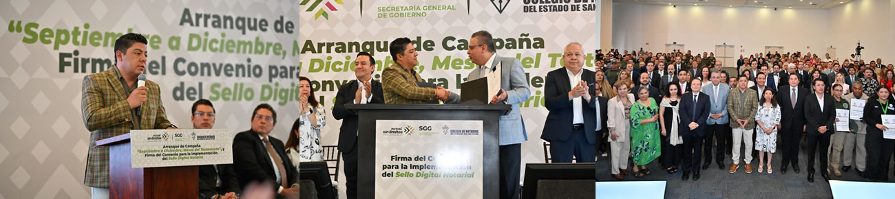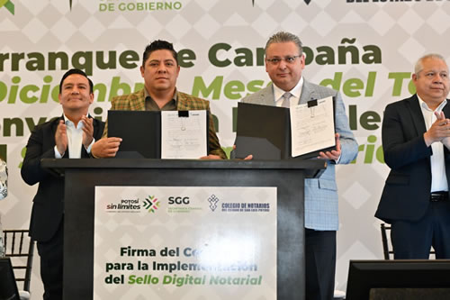 San Luis Potosí SLP.- Para brindar mayor certeza jurídica a las y los potosino, el Gobernador de San Luis Potosí, Ricardo Gallardo Cardona, encabezó el arranque de la campaña “Septiembre a diciembre meses del testamento”, así como la firma de convenio para la implementación del sello digital notarial, con el que se garantiza a la ciudadanía que todos sus trámites ante el notario se realicen conforme a derecho, con voluntad de las partes involucradas y con efectos legales justificados.