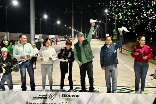 Con la calidez de las y los potosinos, trabajadoras y trabajadores que celebraron esta entrega, el Mandatario Potosino destacó que esta infraestructura de cinco kilómetros, con cuatro carriles, conectará el sur con el oriente de la capital, reduciendo hasta en 30 por ciento los tiempos de traslado y estará conectado a la vía alterna sur y al puente hacia el eje 122, y a la avenida industrias y CFE.
