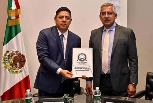 San Luis Potosí SLP.- El titular de la Fiscalía General del Estado (FGE) José Luis Ruiz Contreras, entregó este jueves al Gobernador de San Luis Potosí, Ricardo Gallardo Cardona, el Informe de Actividades 2022, que contiene el balance general de las acciones que esta instancia de investigación llevó a cabo durante este período.