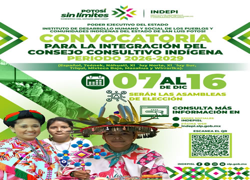 San Luis Potosí SLP.- En estricto respeto a los sistemas normativos y autonomía de las comunidades indígenas, la junta directiva del Instituto de Desarrollo Humano y Social de los Pueblos y Comunidades Indígenas (Indepi) emitió la Convocatoria para la integración del Consejo Consultivo Indígena del período 2026-2029, teniendo las Asambleas de elección del 07 al 16 de diciembre.