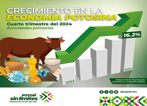San Luis Potosí SLP.- Sin límites, el crecimiento de la economía potosina luego de que durante el cuarto trimestre del 2024 las actividades primarias, -es decir, las relacionadas con agricultura, ganadería, minería y pesca- tuvieron un incremento del 16.2 por ciento comparadas con lo obtenido en el mismo periodo del 2023, lo que ubicó a la entidad en el cuarto lugar nacional con mayor incremento, por debajo de Zacatecas, Campeche y Ciudad de México.