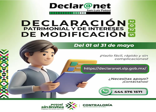 San Luis Potosí SLP.- La Contraloría General del Estado (CGE) invita a las y los trabajadores del Gobierno Estatal a presentar su Declaración de Modificación de Situación Patrimonial y de Intereses 2025, correspondiente al ejercicio fiscal 2024, en el sitio https://declaranet.slp.gob.mx/.
