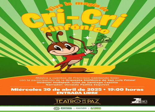 San Luis Potosí SLP.- En el marco del Día de la niñez, la Secretaría de Cultura (Secult), invita a disfrutar del mágico Concierto Cri-Cri Sinfónico, este 30 de abril de 2025, a las 19:00 horas, en el emblemático Teatro de La Paz, con entrada libre.