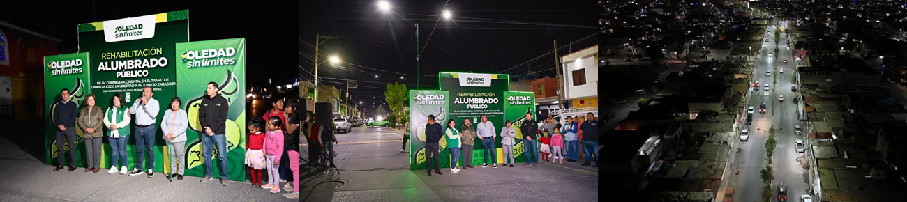 Soledad de Graciano Sánchez SLP.- Juan Manuel Navarro Muñiz, Alcalde de Soledad de Graciano Sánchez, entregó a miles de familias de la zona oriente del municipio, el encendido de la renovación del alumbrado público de la avenida Cordillera Oriental, obra que representó una inversión de 6.6 millones de pesos y la instalación de 220 luminarias LED, con lo que se fortalece la seguridad y movilidad de una de las vialidades más importantes del municipio, en beneficio de más de 24 mil personas.