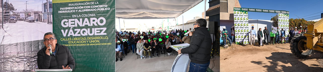 Soledad de Graciano Sánchez SLP.- Juan Manuel Navarro Muñiz, Alcalde de Soledad de Graciano Sánchez, inauguró y entregó oficialmente, este martes, la pavimentación con concreto hidráulico y alumbrado público de las calles Revolución, Libertad, Desarrollo, Educación y Unión, en la colonia Genaro Vázquez, una obra histórica que marca un antes y un después para más de 4 mil 200 beneficiarios, con una inversión superior a los 19 millones de pesos, con lo que se logra transformar por completo la vida diaria de las familias que por años esperaron calles dignas, seguras y funcionales.