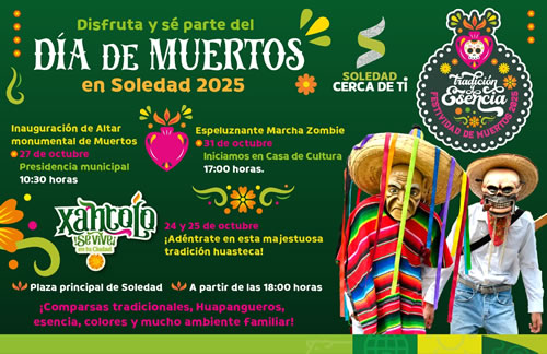 Con el interés del Alcalde Juan Manuel Navarro Muñiz, de acercar este tipo de eventos a las familias y fomentar la preservación de las costumbres que unen a las y los soledenses, durante el 24 y 25 de octubre, la Plaza Principal será escenario de “El Xantolo se vive en tu ciudad”, con comparsas, música huapanguera, colores, danzas y un ambiente completamente familiar desde las 18:00 horas; el 26 de octubre se efectuará el Desfile Representativo “Xantolo en Soledad”, que partirá de la Plaza Citadina a las 17:00 horas, seguido de la presentación del grupo “Palma de la Cruz” a las 18:30 horas en el corazón del municipio.