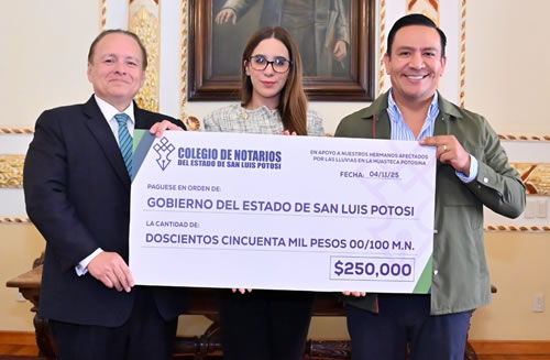 San Luis Potosí SLP.- El Colegio de Notarios del Estado de San Luis Potosí se sumó a la campaña Todos Unidos por la Huasteca, para seguir brindando apoyo a las familias mediante acciones de atención y reconstrucción en las comunidades afectadas por las lluvias.