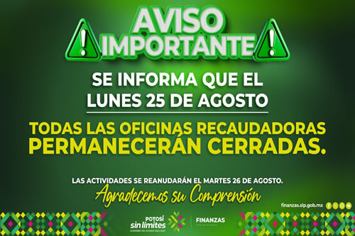 San Luis Potosí SLP.- La Secretaría de Finanzas (Sefin) informó que, con motivo de la conmemoración de San Luis Rey de Francia, día feriado oficial, las oficinas recaudadoras de las cuatro regiones del Estado permanecerán cerradas el lunes 25 de agosto.