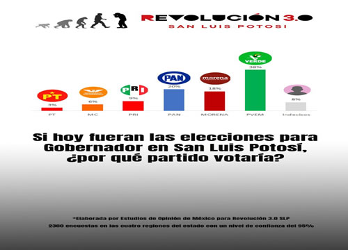 San Luis Potosí SLP.- Una encuesta levantada en las cuatro regiones de San Luis Potosí muestra que el Partido Verde se perfila como la principal fuerza política en la contienda por la gubernatura del estado, al concentrar el 38 por ciento de la intención de voto en un escenario hipotético de elección celebrada en este momento.
