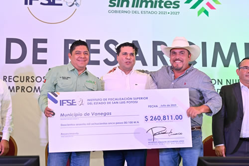 San Luis Potosí SLP.- En evento simbólico ante representantes del Poder Legislativo y Judicial, el Gobernador de San Luis Potosí Ricardo Gallardo Cardona, a través del Instituto de Fiscalización Superior, comenzó con el resarcimiento del dinero público que fue robado por administraciones pasadas de la herencia maldita, cuyos beneficiados ahora son los ayuntamientos actuales que recibirán diversos montos económicos para invertirlos en seguridad, servicios de salud y en infraestructura.