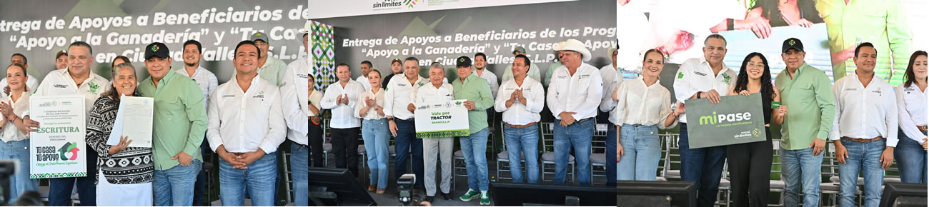 Posteriormente en un evento con familias y productores, el Gobernador Ricardo Gallardo entregó tractores, equipos e implementos agropecuarios con inversión de 20 millones de pesos para diversos municipios de la huasteca, además de escrituras a 140 familias vallenses que por más de 20 años habían solicitado regularizarse de las colonias: Hermosa Provincia, Montecillos, Luis Donaldo Colosio, Balcones, Troncones, La Corriente y Cañitas, con el programa “Tu Casa, Tu Apoyo”.