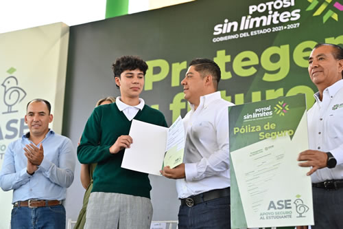 San Luis Potosí SLP.- Durante la entrega de pólizas del Apoyo Seguro al Estudiante, el Gobernador de San Luis Potosí, Ricardo Gallardo Cardona anunció obras en dos secundarias legendarias: cancha de pasto sintético en la Justo A. Zamudio Vargas y sala de cómputo y baños nuevos en la Dionisio Zavala.