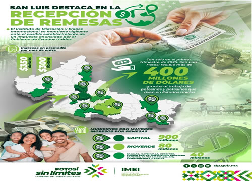 Tan solo en el primer trimestre de 2025, San Luis Potosí recibió más de 400 millones de dólares gracias al trabajo de potosinas y potosinos que viven en Estados Unidos los cuales mandan ingresos a sus familias que en promedio oscilan entre 300 y 380 dólares mensuales.