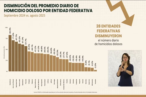 San Luis Potosí alcanzó una reducción histórica en homicidios dolosos del 71 por ciento de septiembre de 2024 a agosto de 2025, lo que lo posiciona como el segundo Estado con mayor disminución, sólo después de Zacatecas, de acuerdo a datos del Secretariado Ejecutivo del Sistema Nacional de Seguridad Pública (SNSP), lo que confirma la exitosa estrategia de seguridad impulsada por el Gobernador Ricardo Gallardo Cardona.