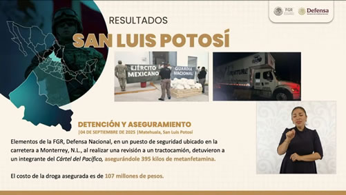 Durante la Conferencia Matutina de la Presidenta de México Claudia Sheinbaum Pardo, se reveló que San Luis Potosí representa sólo el 1 por ciento de las víctimas de homicidio doloso a nivel nacional de enero a agosto de 2025, mientras que en agosto de 2025 apenas representó el 0.5 por ciento del total nacional y el secretario de Seguridad Omar García Harfuch, reportó un operativo de relevancia en Matehuala con el que también se impone la paz y el orden en el territorio potosino.