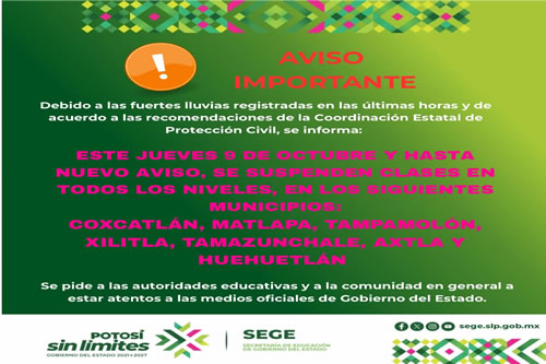 San Luis Potosí SLP.- Debido a las fuertes lluvias registradas en las últimas horas y por recomendación de la Coordinación Estatal de Protección Civil (CEPC), la Secretaría de Educación del Gobierno del Estado (SEGE) informa que se suspenden clases este jueves 9 de octubre y hasta nuevo aviso en los municipios: Coxcatlán, Matlapa, Tampamolón, Xilitla, Tamazunchale, Axtla de Terrazas y Huehuetlán.