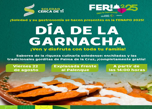 Soledad de Graciano Sánchez ya está listo para llevar todo el sabor de su gastronomía a la Feria Nacional Potosina (FENAPO) este viernes 22 de agosto; el Alcalde, Juan Manuel Navarro Muñiz, anunció que se ofrecerán más de 8 mil platillos gratuitos para las y los visitantes, destacando la producción de más de 35 mil enchiladas soledenses, símbolo de la riqueza culinaria del municipio y reconocida como Patrimonio Cultural Inmaterial de la Humanidad.