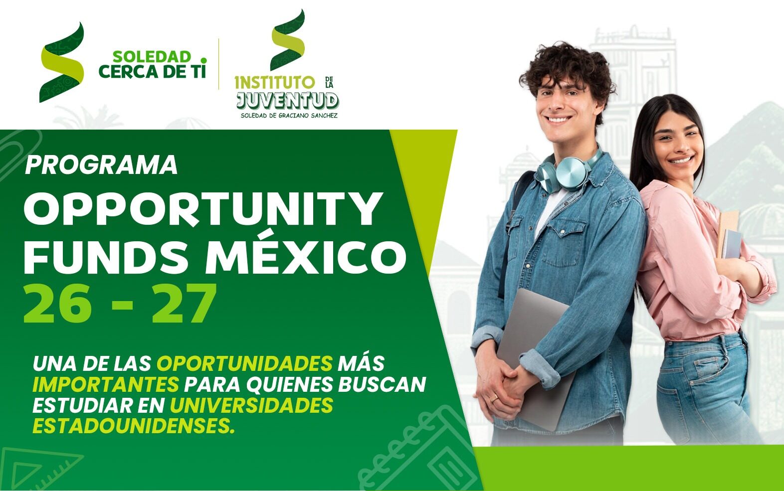 Soledad de Graciano Sánchez, México.- Con el propósito de acercar oportunidades académicas de alto nivel a la juventud soledense, el Ayuntamiento de Soledad de Graciano Sánchez, a través del Instituto Municipal de la Juventud, invitó a estudiantes del municipio a participar en la convocatoria Opportunity Funds, uno de los programas más destacados para acceder a estudios universitarios en Estados Unidos. La iniciativa responde a las directrices del alcalde Juan Manuel Navarro Muñiz, orientadas a fortalecer el futuro educativo de las y los jóvenes.