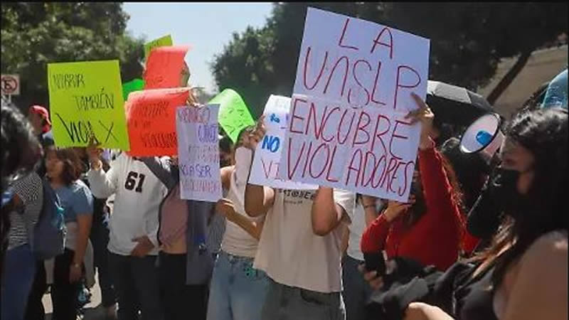 San Luis Potosí, México.- Estudiantes organizadas de la Facultad de Derecho de la Universidad Autónoma de San Luis Potosí (UASLP) tomaron las instalaciones del plantel, calles de la capital potosina y el edificio central de la Universidad, en protesta por el caso de abuso sexual cometido contra una compañera y por lo que califican como “indiferencia, encubrimiento y omisión” de las autoridades universitarias.