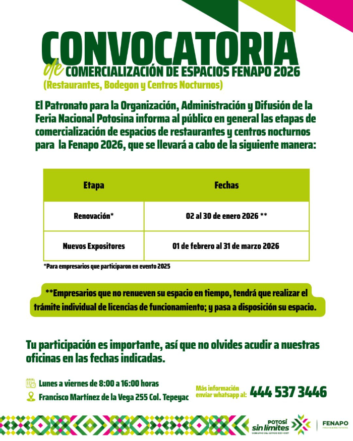 Finalmente, el Patronato informó que la etapa de registro para nuevos expositores se abrirá del 1 de marzo al 31 de mayo de 2026, con el objetivo de ampliar la oferta comercial y fortalecer la planeación integral de la Fenapo 2026.