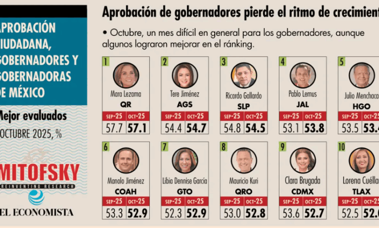 San Luis Potosí, México. El Gobernador Ricardo Gallardo Cardona se ubicó en el tercer lugar nacional de aprobación ciudadana durante el mes de octubre, según el más reciente Ranking Mitofsky, difundido por el diario El Economista. El mandatario potosino alcanzó un 54.8 por ciento de respaldo, siendo superado únicamente por Mara Lezama (Quintana Roo) y Tere Jiménez (Aguascalientes).