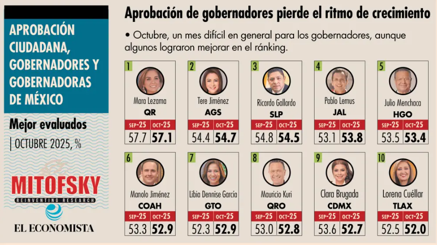 San Luis Potosí, México. El Gobernador Ricardo Gallardo Cardona se ubicó en el tercer lugar nacional de aprobación ciudadana durante el mes de octubre, según el más reciente Ranking Mitofsky, difundido por el diario El Economista. El mandatario potosino alcanzó un 54.8 por ciento de respaldo, siendo superado únicamente por Mara Lezama (Quintana Roo) y Tere Jiménez (Aguascalientes).