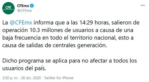 “La CFE informa que a las 14:29 horas (tiempo central de México), salieron de operación 10.3 millones de usuarios a causa de una baja frecuencia en todo el territorio nacional, esto a causa de salidas de centrales generación. Dicho programa se aplica para no afectar a todos los usuarios del país”, dijo a través de Twitter.