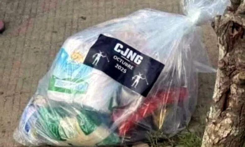 “De parte del Cártel de Jalisco Nueva Generación”, dice uno de los sujetos mientras reparte ayuda marcada con las siglas CJNG.