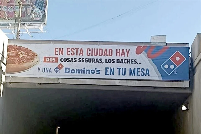 En San Luis Potosí, la clausura de una sucursal de Domino’s Pizza provocó gran revuelo entre la población y en redes sociales, luego de que la cadena de pizzerías lanzara una campaña publicitaria en la que hacía referencia al problema de los baches en la ciudad. El anuncio, colocado en una vía principal, ironizaba sobre el mal estado de las calles al señalar que en la capital potosina hay dos cosas seguras: los baches y una pizza en la mesa.
