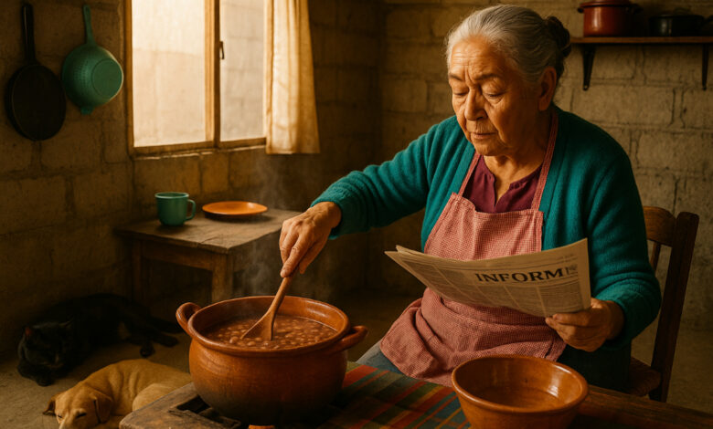 Por: Doña Carmen, sazonando una olla de frijoles mientras lee el periódico.