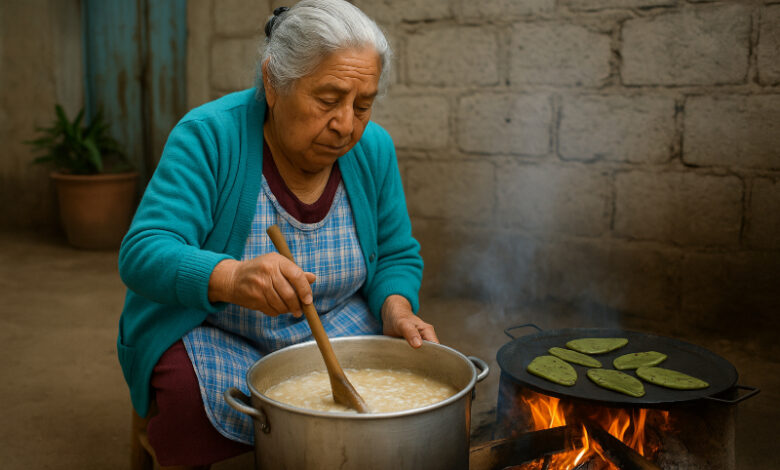 Por: Doña Carmen, dándole vueltas al nixtamal mientras se cosen los nopales.