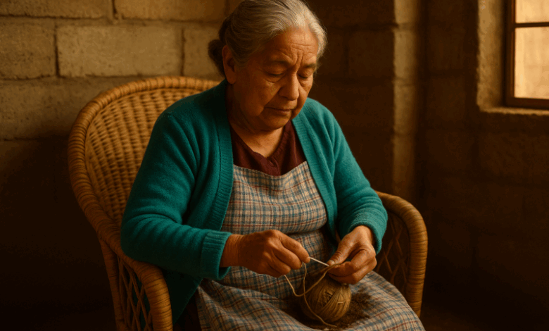 Mientras desenreda lana y escucha ecos de portazos lejanos,