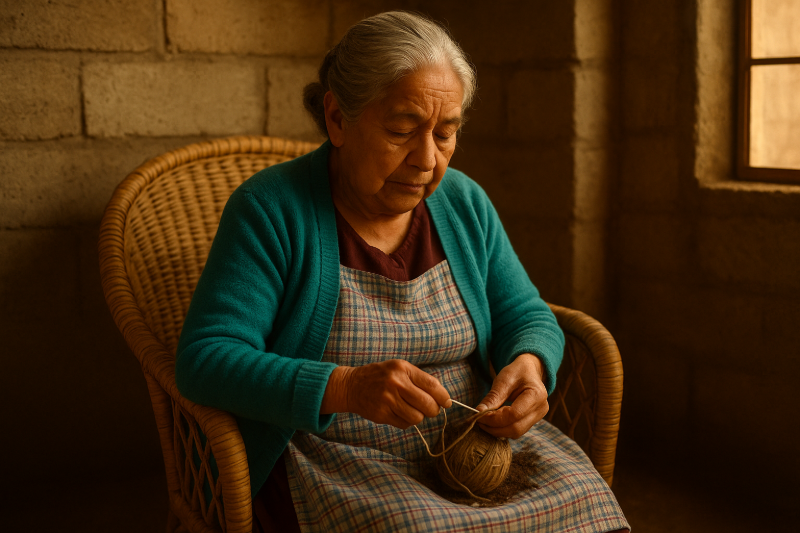 Por: Doña Carmen, desenredando un ovillo de estambre en su sillón de tule.